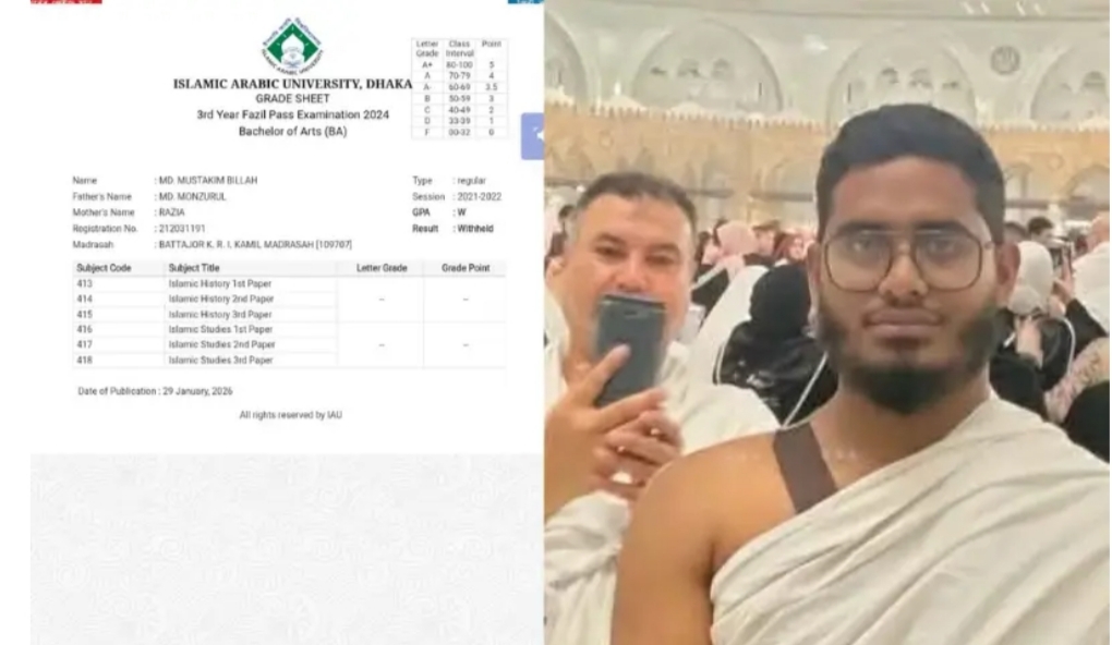 জানা যায়, ২০২৫ সালের ২৭ নভেম্বর ইসলামি স্টাডিজ (বিষয় কোড–৪১৬) পরীক্ষা অনুষ্ঠিত হয়। অভিযোগ রয়েছে, ওই সময় বকশীগঞ্জ উপজেলার বাট্টাজোড় ইউনিয়নের ফুলদহপাড়া গ্রামের বাসিন্দা মনজুরুল হকের ছেলে মোস্তাকিম বিল্লাহ সৌদি আরবে অবস্থান করছিলেন। সংশ্লিষ্ট সূত্র ও মাদরাসা কর্তৃপক্ষ জানিয়েছে, বিদেশে অবস্থানের কারণে তিনি পরীক্ষায় অংশগ্রহণ করেননি।