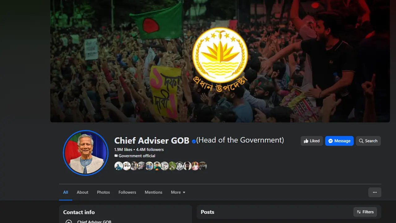 উল্লেখ্য, প্রধান উপদেষ্টার অফিশিয়াল পেজের নাম ‘Chief Adviser GOB (Head of the Government)’ খোলা হয় ১৪ আগস্ট ২০২৪ সালে। এই পেজে বর্তমানে প্রায় ৪৪ লাখের বেশি ফলোয়ার রয়েছে।