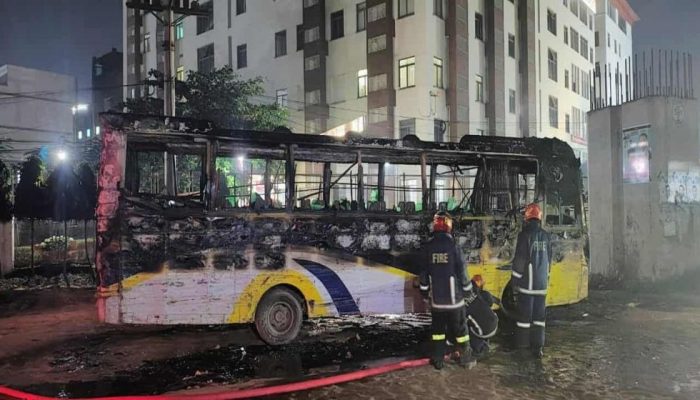 ফায়ার সার্ভিস ও স্থানীয়রা জানায়, ভোর পৌনে ৫টার দিকে একটি মোটরসাইকেলে দুজন লোক এসে বাসে আগুন ধরিয়ে কয়েক রাউন্ড ফাঁকা গুলি ছুড়ে পালিয়ে যায়। পরে স্থানীয়রা ফায়ার সার্ভিসে ফোন দিলে ফায়ার সার্ভিসের একটি ইউনিট ঘটনাস্থলে এসে আগুন নিয়ন্ত্রণে নেয়। ততক্ষণে বাসের ভিতরের সব পুড়ে যায়।