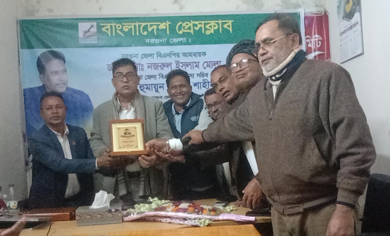 বরগুনা ১ আসনে বিএনপি মনোনীত প্রার্থী, বরগুনা জেলা বিএনপির আহবায়ক নজরুল ইসলাম মোল্লাকে বাংলাদেশ প্রেসক্লাব বরগুনা জেলার শাখার পক্ষ থেকে ফুলেল সংবর্ধনা ও সম্মাননা স্মারক দেওয়া হয়েছে। রোববার (৬ ডিসেম্বর ২৫) রাত ৮ টায় পৌর মার্কেটের দ্বিতীয় তলায় বাংলাদেশ প্রেসক্লাব বরগুনা জেলা শাখার অস্থায়ী কার্যালয় এ সংবর্ধনা দেওয়া হয়।