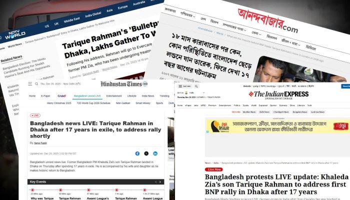 ভারতের আরেক জনপ্রিয় সংবাদমাধ্যম হিন্দুস্তান টাইমসের শিরোনামে বলা হয়েছে, ১৭ বছর নির্বাসনের পর ঢাকায় তারেক রহমান, কিছুক্ষণের মধ্যেই সমাবেশে ভাষণ দেবেন। এতে বলা হয়েছে, বাংলাদেশ জাতীয়তাবাদী দলের (বিএনপি) ভারপ্রাপ্ত চেয়ারম্যান তারেক রহমান ১৭ বছর পর যুক্তরাজ্যের লন্ডনে নির্বাসিত জীবন শেষে বৃহস্পতিবার ঢাকায় পৌঁছেছেন। তার সঙ্গে দেশে ফিরেছেন স্ত্রী জোবাইদা রহমান ও কন্যা জাইমা রহমান। হযরত শাহজালাল আন্তর্জাতিক বিমানবন্দর থেকে সরাসরি পূর্বাচলের ‘৩০০ ফিট’ এলাকায় আয়োজিত এক সমাবেশে যোগ দেওয়ার কথা রয়েছে তারেক রহমানের, যেখানে তিনি নেতাকর্মীদের উদ্দেশে ভাষণ দেবেন।
